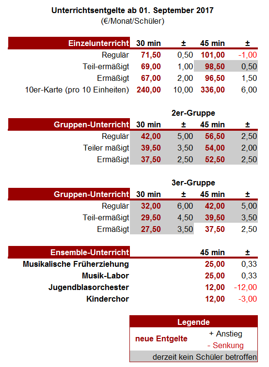 Die Entgelte für Einzelunterricht steigen um einen Betrag von 0,5 bis 2 €/Monat; das entspricht einer Erhöhung von 0,7 bis 3,1 %. Für reguläre Schüler, die eine Unterrichtseinheit von 45 min belegen, ergibt sich sogar eine Senkung von -1 %.